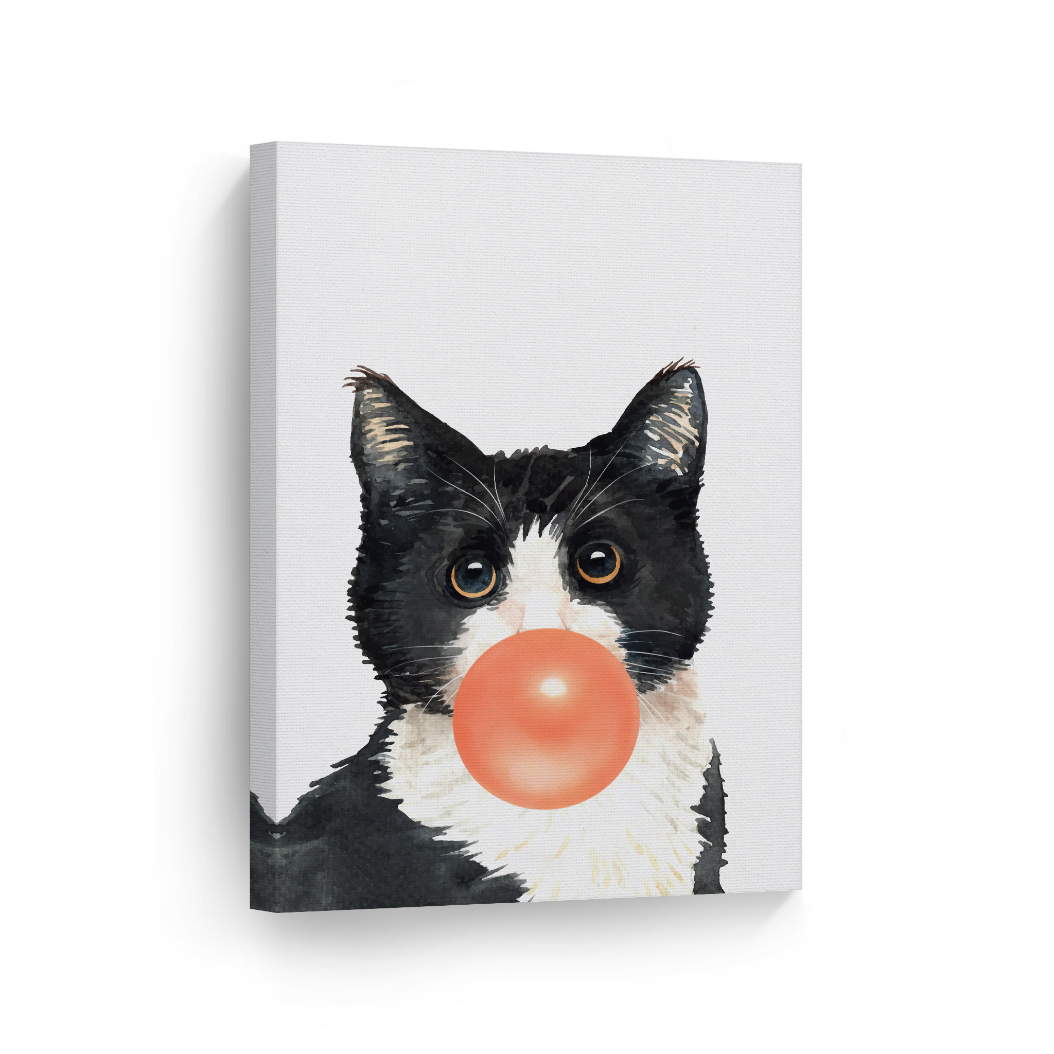 Smile Art Design Portrait Of Cat Chewing Orange Bubble Gum Canvas Wall Art Print Pet Cat Lover Gift Animal Pop Art Office Living Room Bedroom Kids Baby Nursery Room Decor 36x24